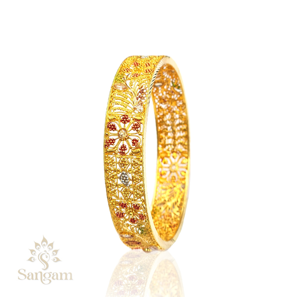 A 22KT fancy bangle in yellow gold (47.980gms). It looks lovely in the classic traditional design